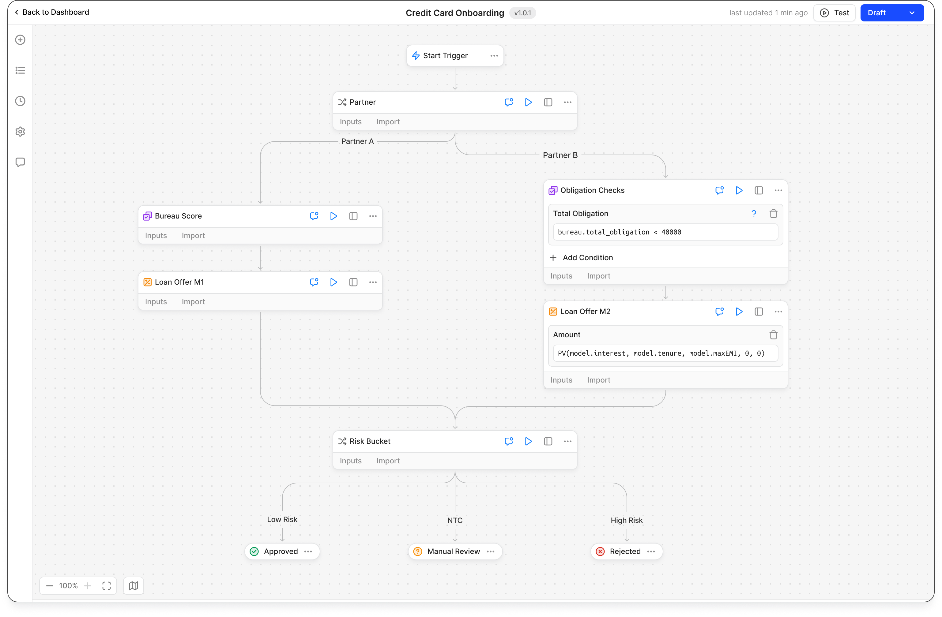 Automated loan approval processes by enabling banks to create workflows in a no-code studio with custom rules and expressions for decision making and calculations.