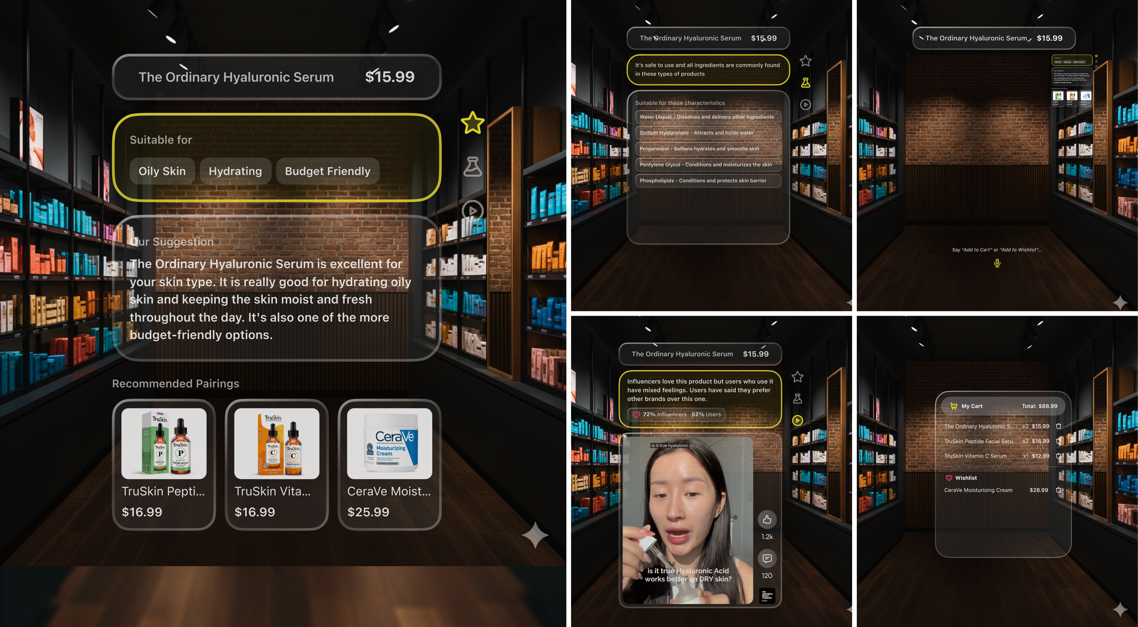 Next, we're developing natural gesture recognition using computer vision to recognize shopping behaviors without voice commands. We're also exploring expanded categories beyond beauty, real-time inventory integration, AR navigation, and a B2B analytics dashboard for retailers to understand shopper behavior and engagement patterns.